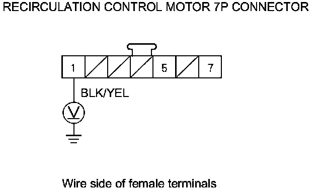 4. Measure the voltage between recirculation control motor 7P connector terminal No. 1 and body ground.