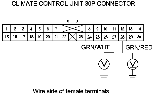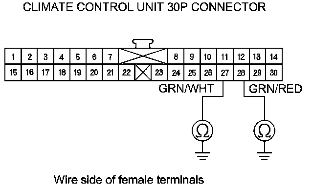 8. Check for continuity between body ground and climate control unit 30P connector terminals No. 27 and No. 28 individually.