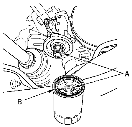 3. Inspect the threads (A) and the rubber seal (B) on the new filter. Clean the seat on the oil filter base, then apply a light coat of new engine oil to the filter rubber seal. Use only filters with a built-in bypass system.