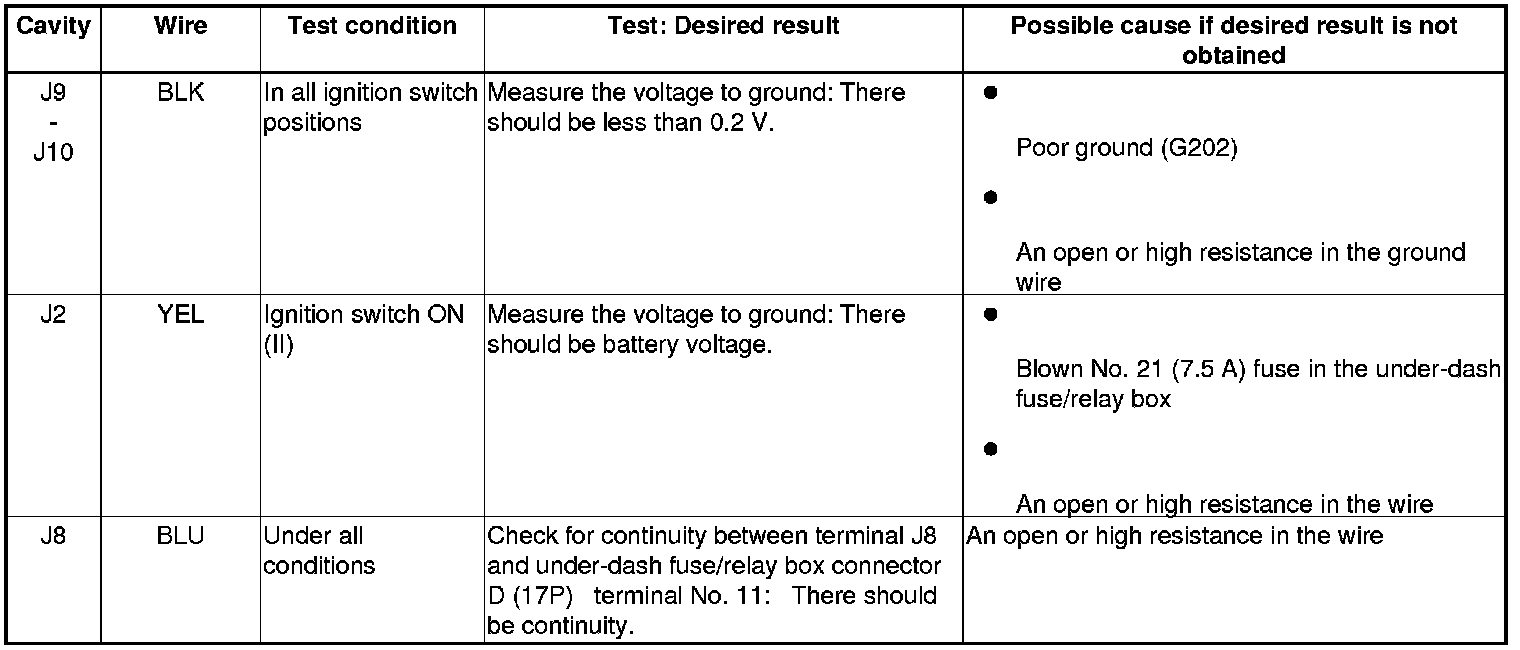 7. Reconnect the connector to the under-hood fuse/relay box, and do the following input tests: