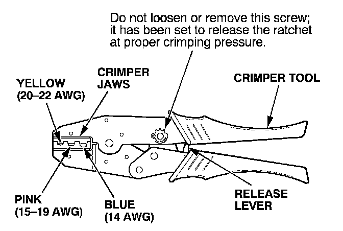 8. Put the splice connector in the proper size slot in the Crimper Tool, slide it to one end (where the flare begins), and close the crimper handles far enough to hold it in place. To release the ratchet mechanism at any point after the first click, squeeze the handles slightly and push the release lever, then let the handles open.