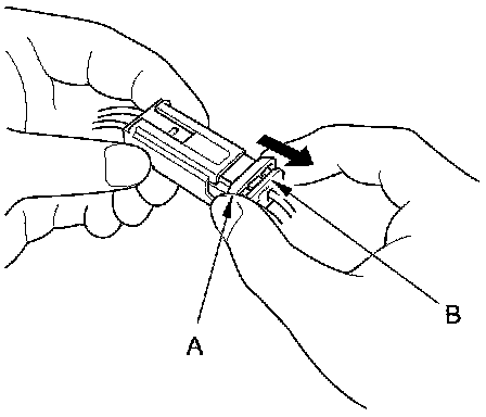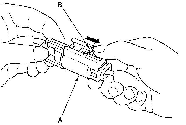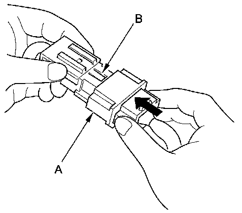 1. To reconnect, hold the pawl-side connector, and press on the back of the sleeve-side connector in the direction shown. As the two connector halves are pressed together, the sleeve (A) is pushed back by the pawl (B). Do not touch the sleeve.