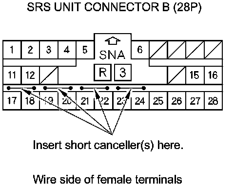 Terminal numbers are shown from the wire side of the female terminals. Insert the SRS short canceller(s) into the cavities on the terminal side of the connector.