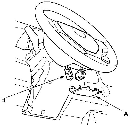 4. Remove the access panel (A) from the steering wheel, then disconnect the driver's airbag inflator 4P connector (B) from the cable reel.