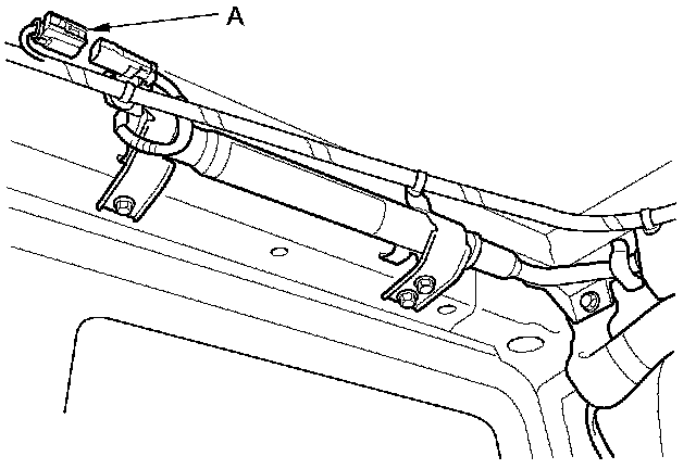 9. Disconnect the roof wire harness 2P connector (A) from the left and right side curtain airbag inflator.