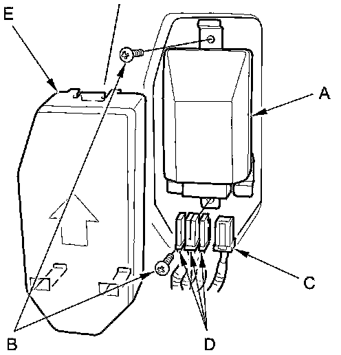 1. Place the ODS unit (A) on the seat-back frame. Tighten the two screws (B), and connect the ODS unit harness 18P connector (C) and OPDS sensor connectors (D) to the ODS unit. Reinstall the cover (E).