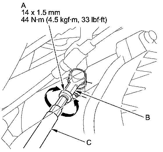 3. Loosen the tie-rod end locknuts (A) while holding the flat surface sections (B) of the tie-rod end with a wrench, and turn both tie-rod arm (C) until the front toe is within specifications.