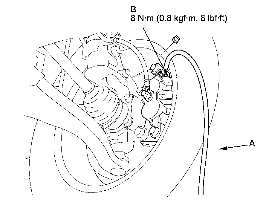 4. Attach a length of clear drain tube (A) to the bleed screw (B), then loosen the bleed screw to allow air to escape from the system. Then tighten the bleed screw securely.