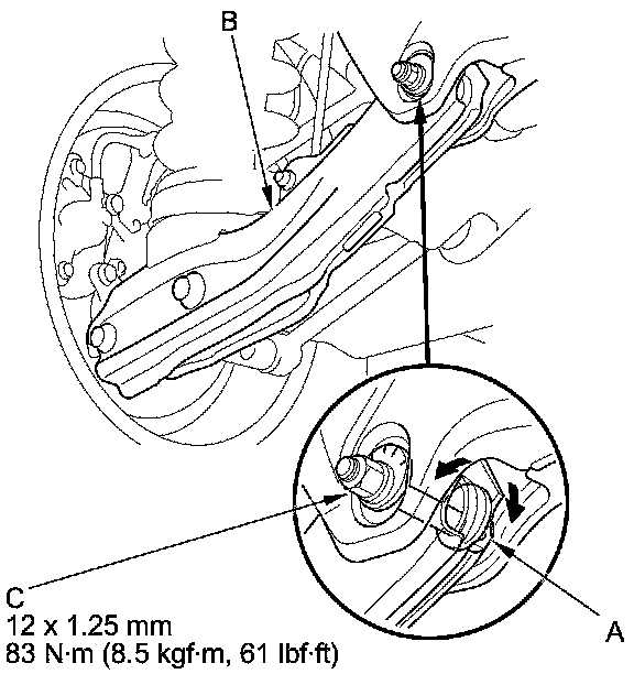 3. Hold the adjusting bolt (A) on the lower arm B, and loosen the self-locking nut (C).