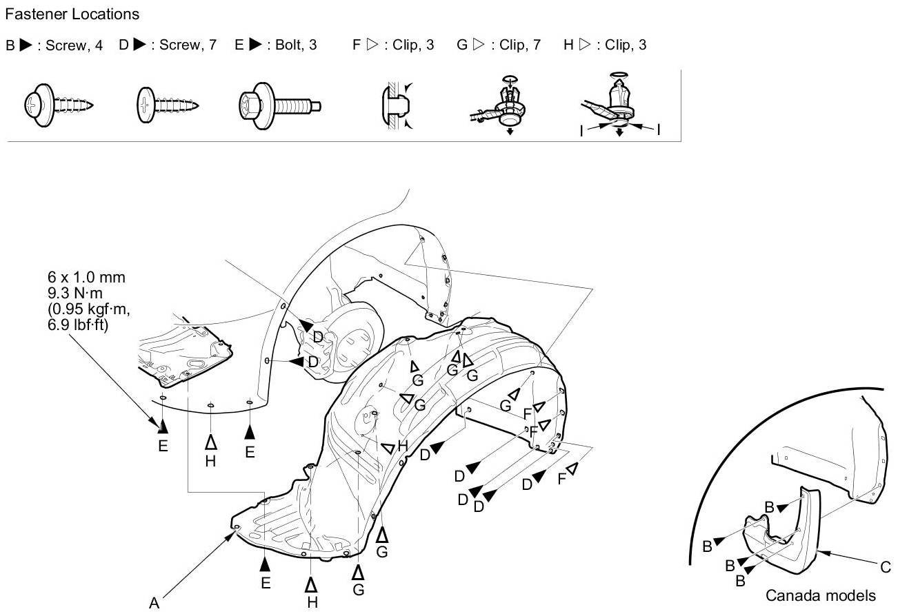 3. Install the inner fender in the reverse order of removal, and note these items: