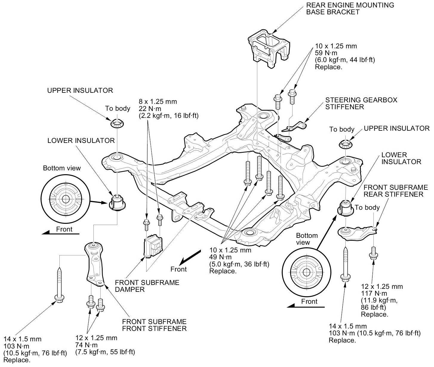 - After removing the subframe mounting bolts, be sure to replace them with new ones.