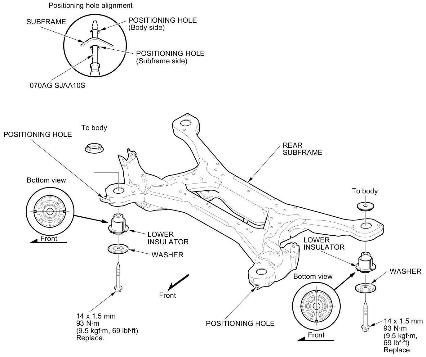 - Install the rear subframe by aligning the positioning holes with the subframe alignment pin.
