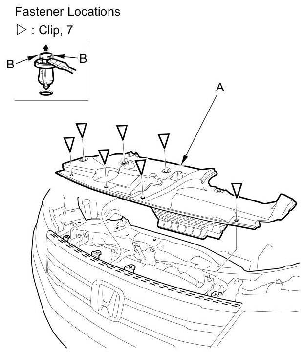 2. Detach the clips, then remove the front bulkhead cover (A).