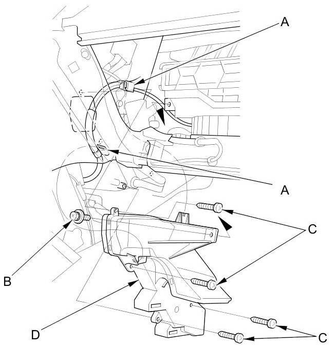 7. Detach the harness clips (A), then remove the self-tapping screw (B), the self-tapping screws (C), and the passenger's heater duct and cover (D).