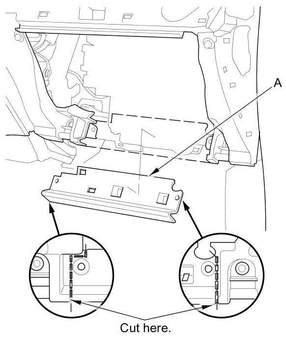 10. Cut the plastic cross brace (A) in the glove box opening with diagonal cutters in the area shown. Retain the plastic cross brace to be reinstalled later.