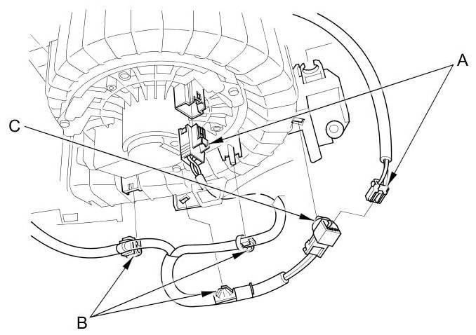 11. Disconnect the connectors (A) from the front blower motor. Detach the harness clips (B) and the connector clip (C).