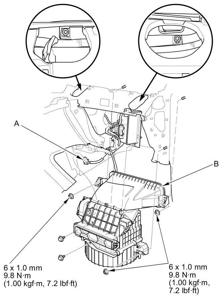 12. Disconnect the connector (A) from the recirculation control motor. Remove the self-tapping screws, the mounting nuts, and the blower unit (B).