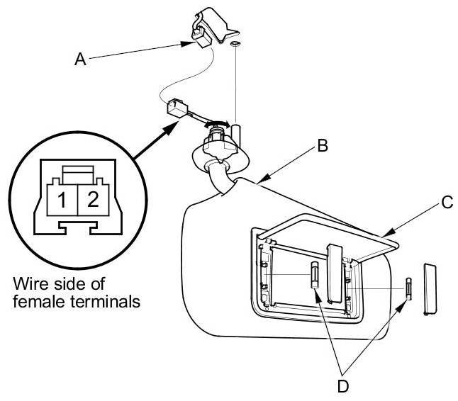4. If the continuity is not as specified, check the bulbs (D). If the bulbs are OK, the vanity mirror light is faulty; replace the sunvisor Service and Repair.