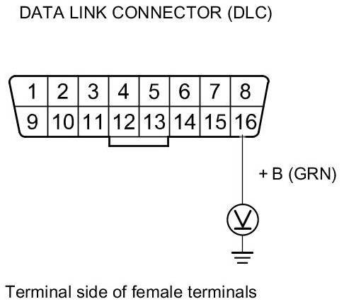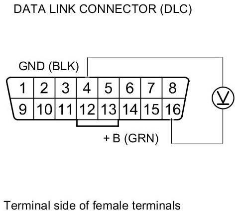 25. Measure the voltage between DLC terminal No. 16 and body ground.