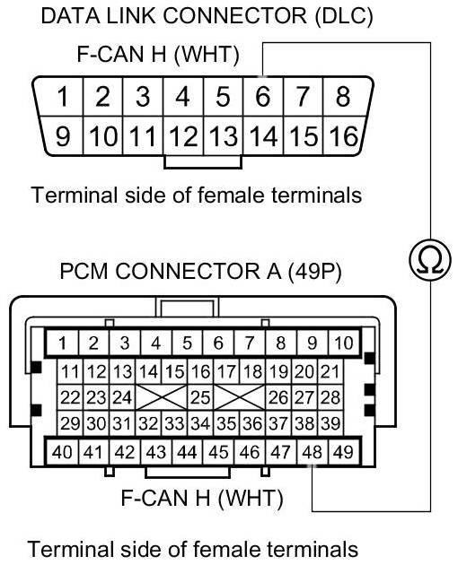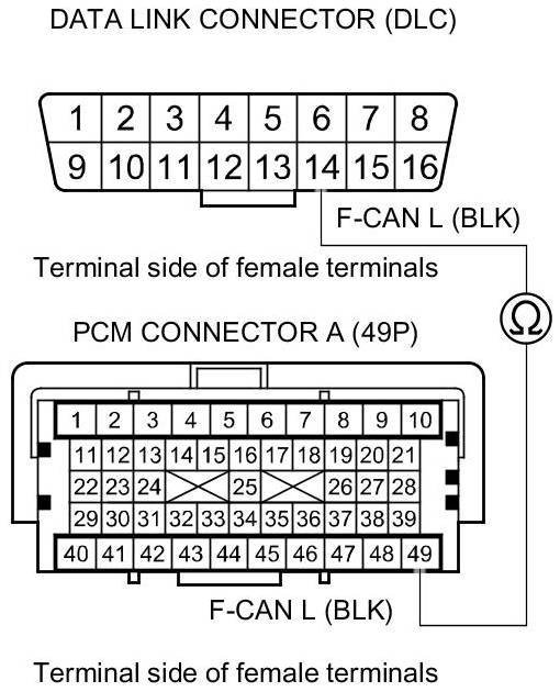 32. Check for continuity between PCM connector terminal A49 and DLC terminal No. 14.