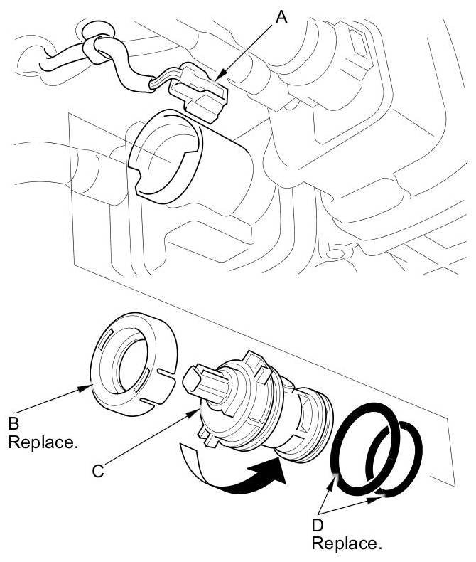 5. Install the parts in the reverse order of removal with new O-rings (D) and a new cap.