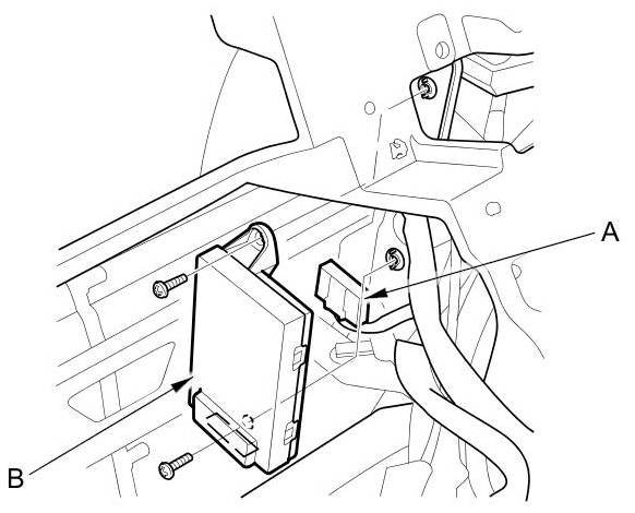 2. Remove the screws, then disconnect the connector (A) from the HandsFreeLink control unit (B), and remove it.