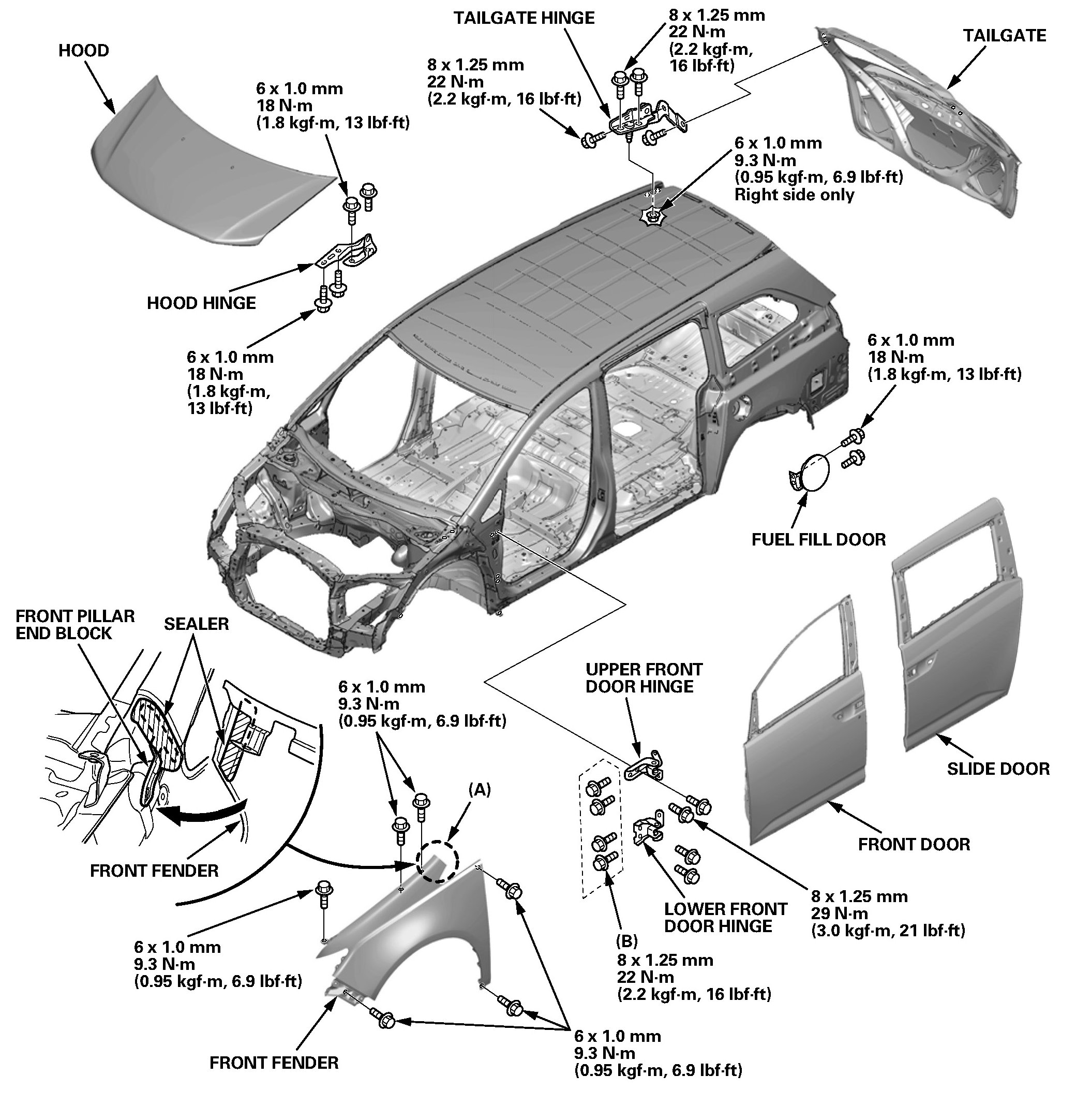 - Check the hood, the doors, and the tailgate positions; refer to the external parts fitting positions.