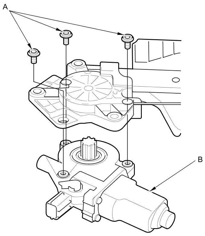 2. Remove the three bolts (A), and separate the rear power window motor (B).