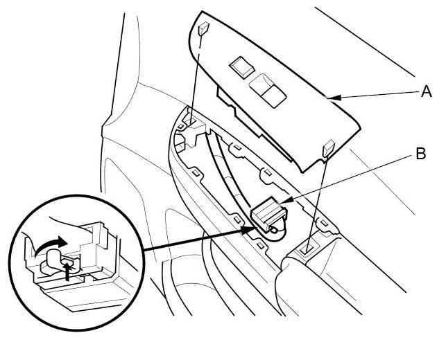 1. Carefully remove the front passenger's power window switch panel (A).