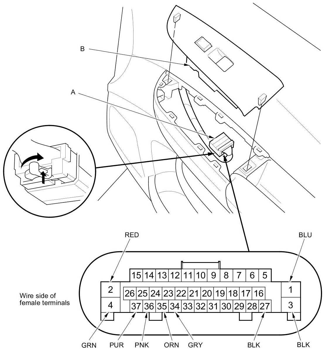 3. Disconnect the 37P connector (A) from the front passenger's power window switch (B).