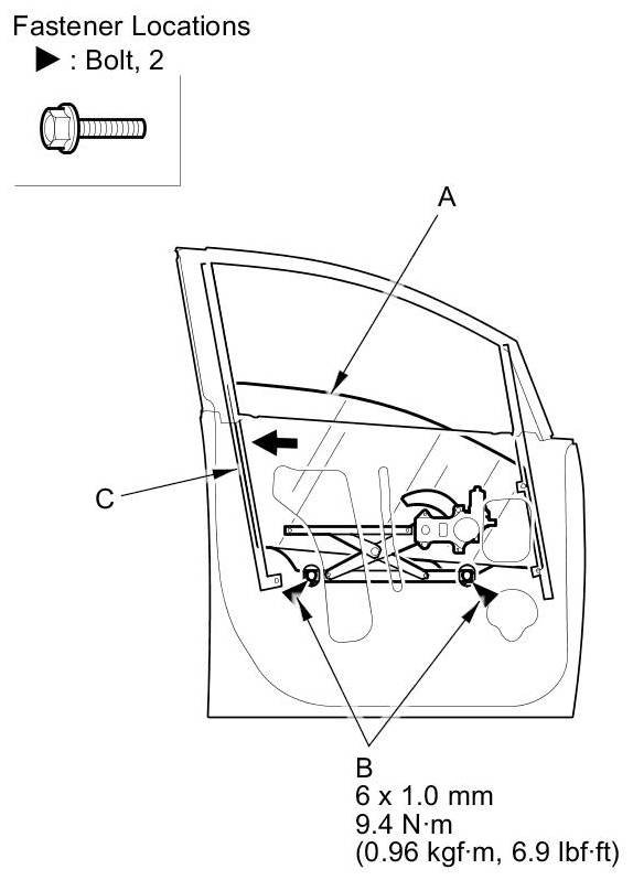 4. Push the glass against the glass run channel (C), then tighten the glass mounting bolts to the specified torque.