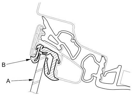 6. Raise the glass fully, and check for gaps. Also check that the glass (A) contacts the glass run channel (B) evenly.