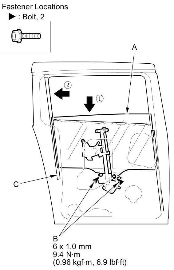 4. Push the glass against the center channel (C), then tighten the glass mounting bolts to the specified torque.