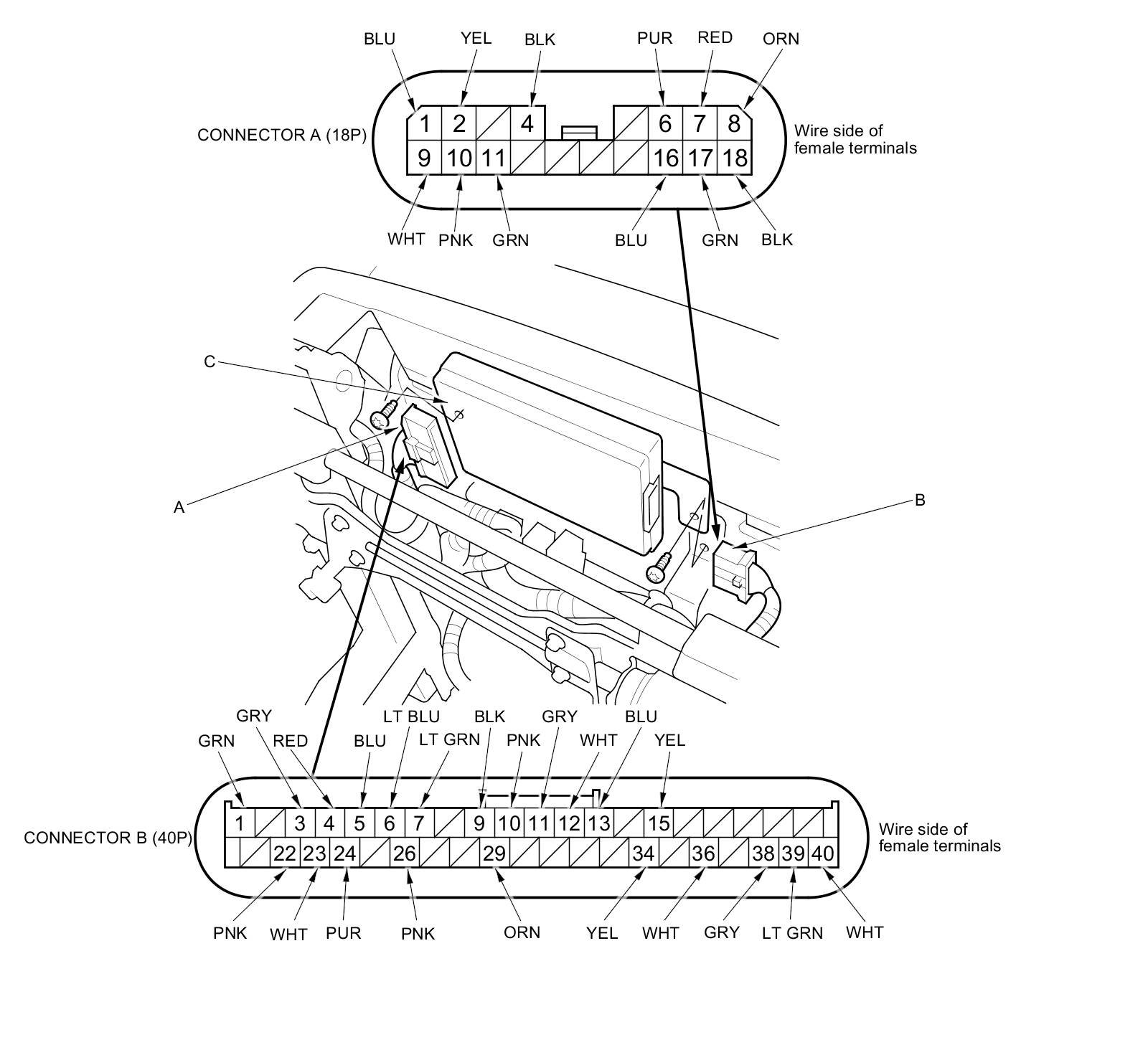 3. Disconnect the 40P connector (A) and 18P connector (B) from the power seat control unit (C).
