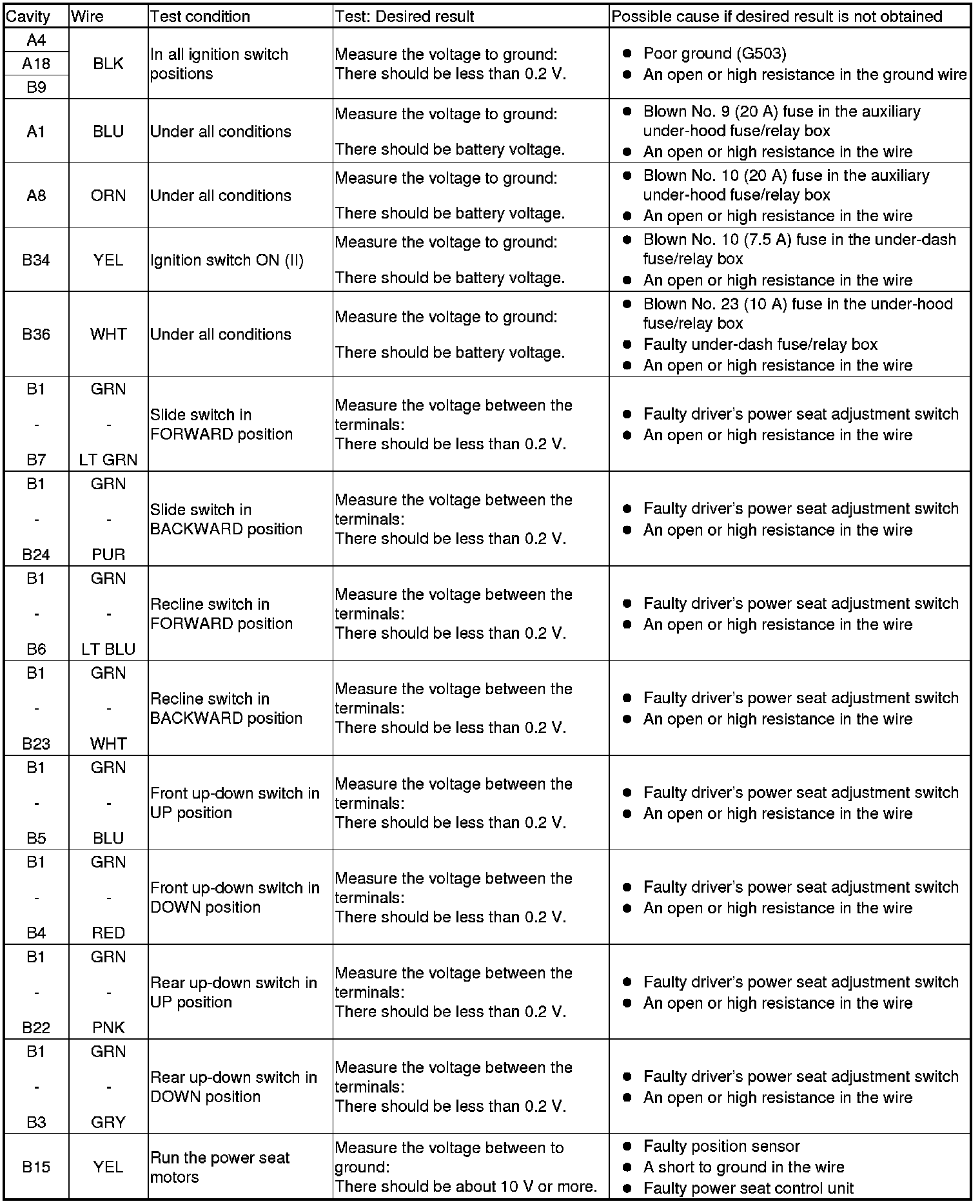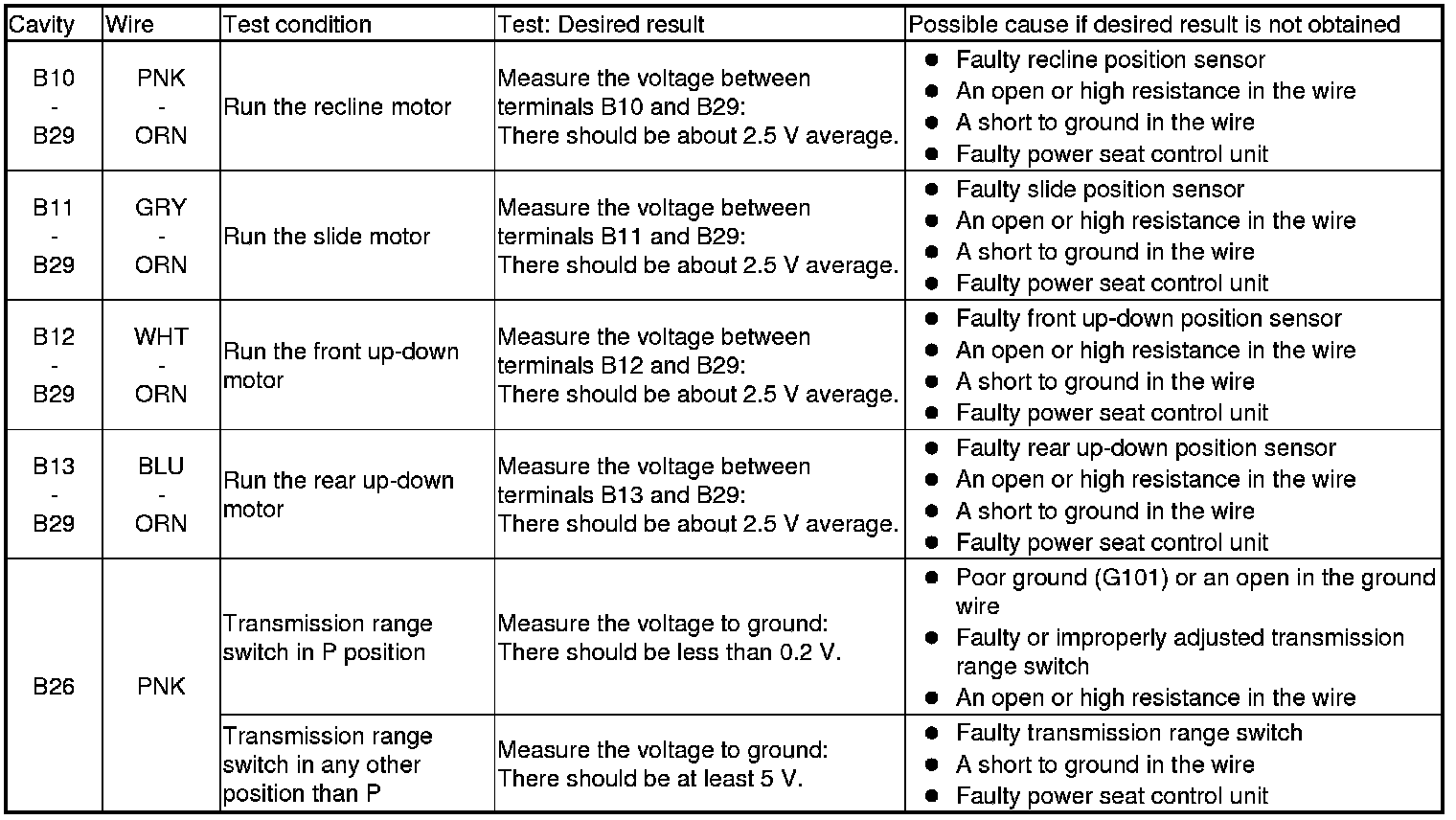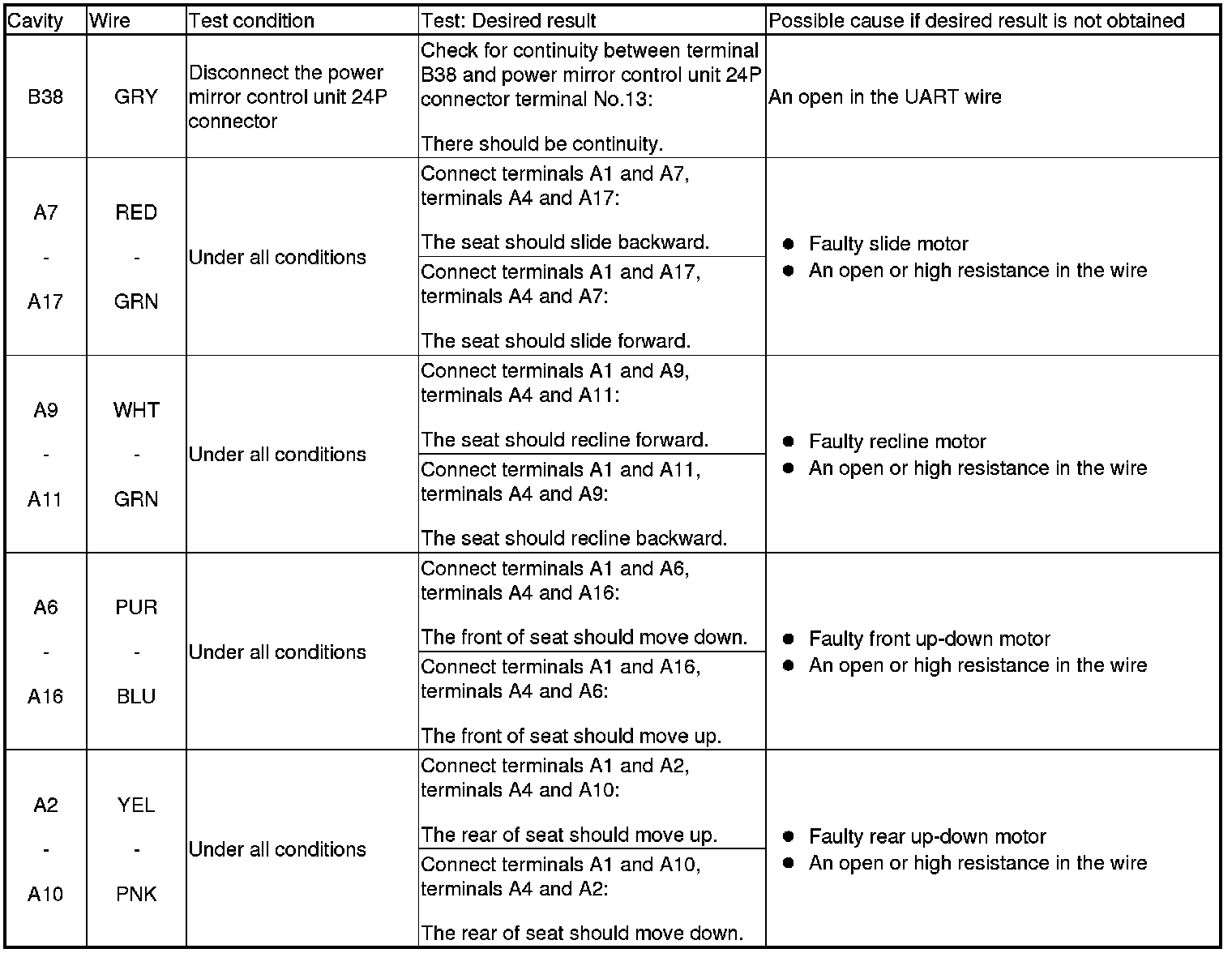 6. Reconnect the connectors to the power seat control unit, and do the following input tests.