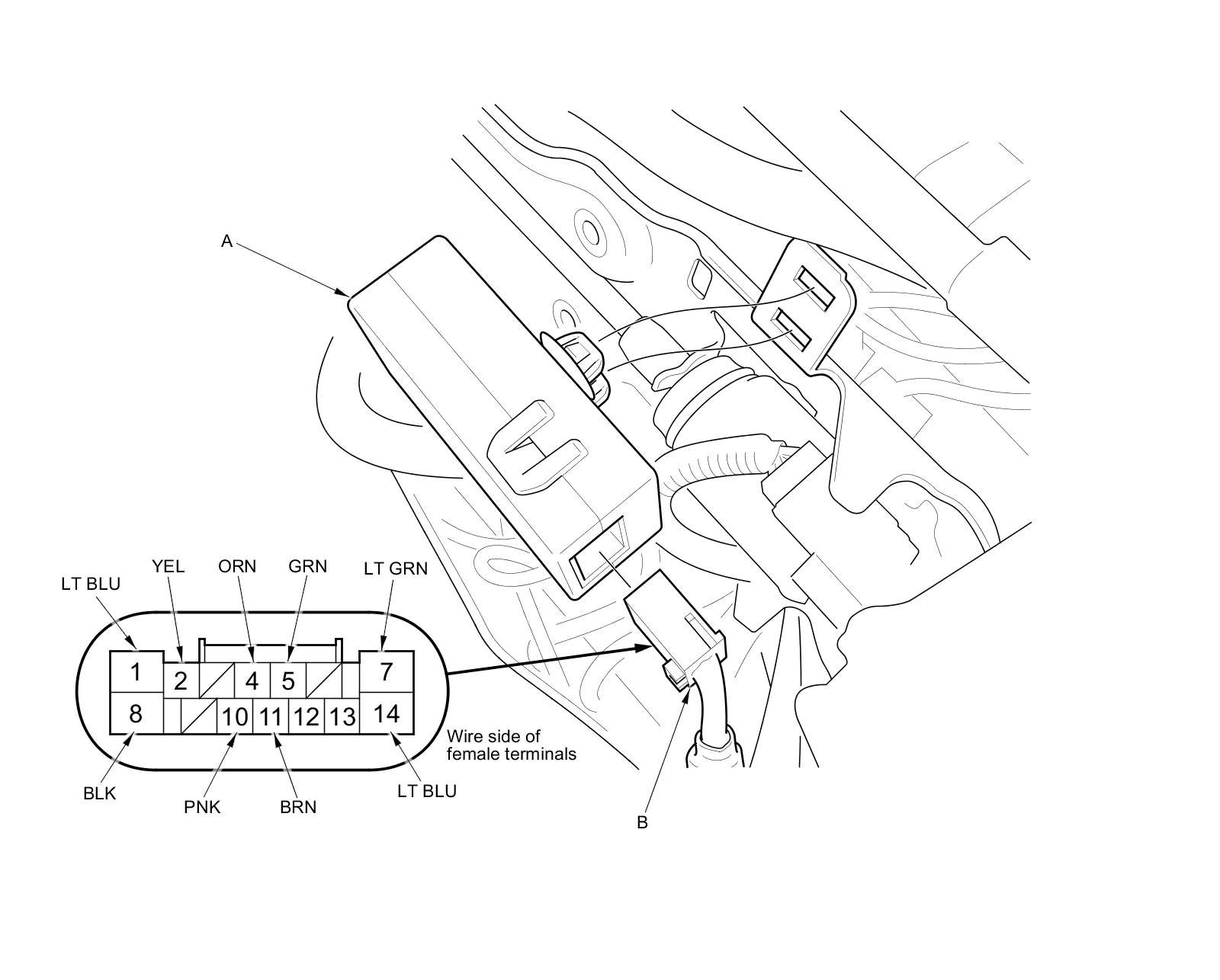 3. Disconnect the 14P connector (B) from the seat heater control unit.