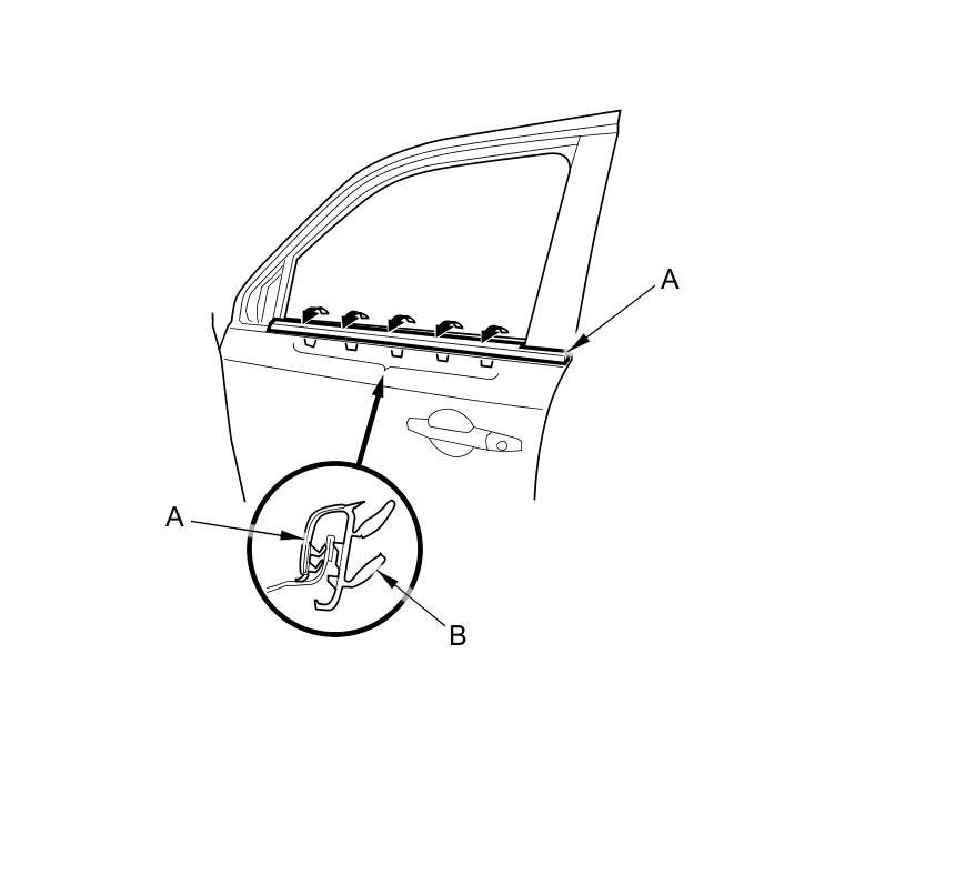 3. Starting at the rear, pull the door glass outer weatherstrip (A) up at each area where the inner molding (B) catches the inside edge of the window slot.
