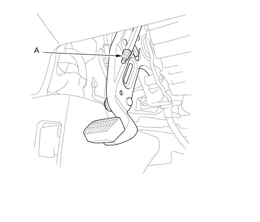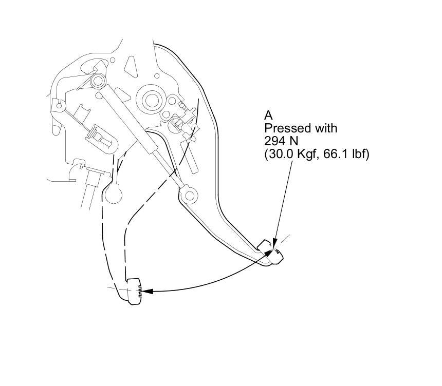 1. Press the parking brake pedal (A) with 294 N (30.0 kgf, 66.1 lbf) of force to fully apply the parking brake. The parking brake pedal should be locked within the specified number of clicks.