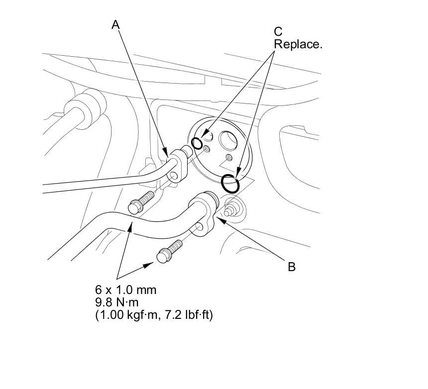 3. Remove the bolts, then disconnect the front receiver line (A) and the front suction line (B) from the front evaporator core. Remove the O-rings (C).
