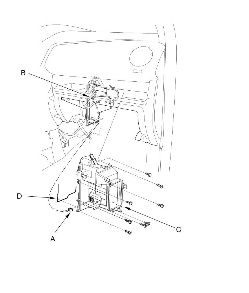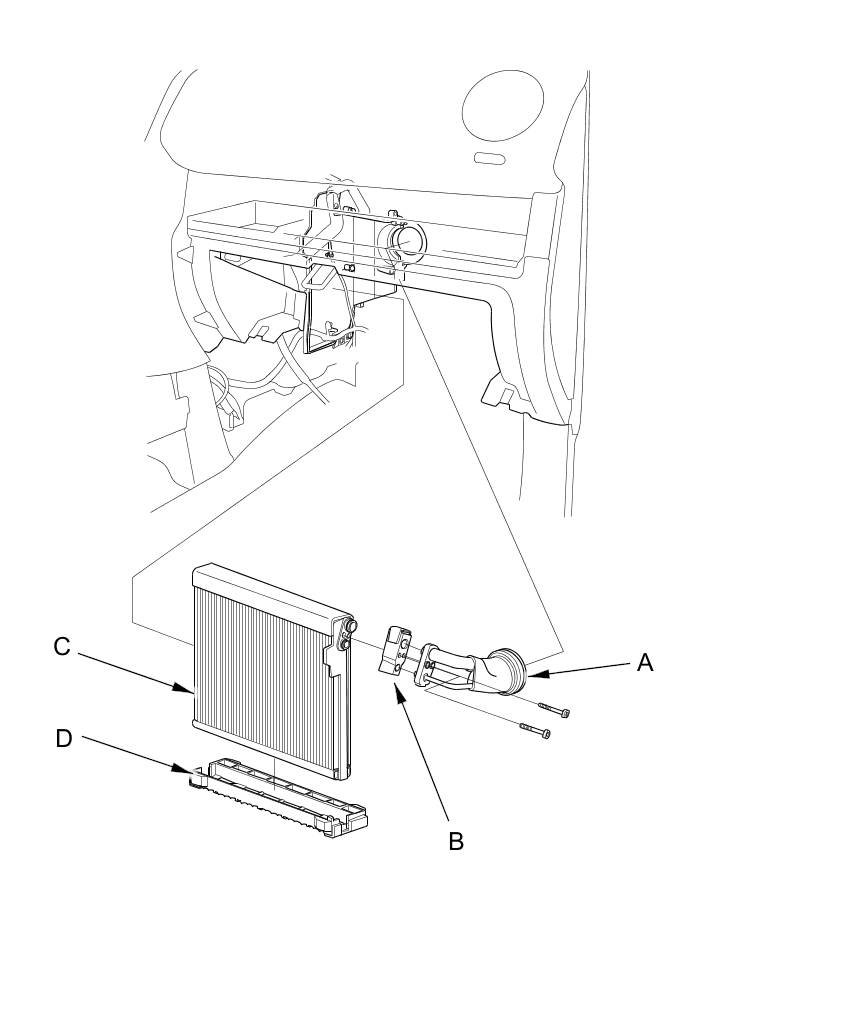 6. Remove the bolts, the inlet and outlet pipes (A), and expansion valve (B). Carefully pull out the front evaporator core (C), then remove the plate (D).