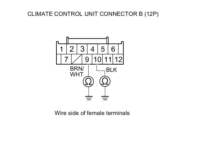 8. Check for continuity between body ground and climate control unit connector B (12P) terminals No. 9 and No. 10 individually.