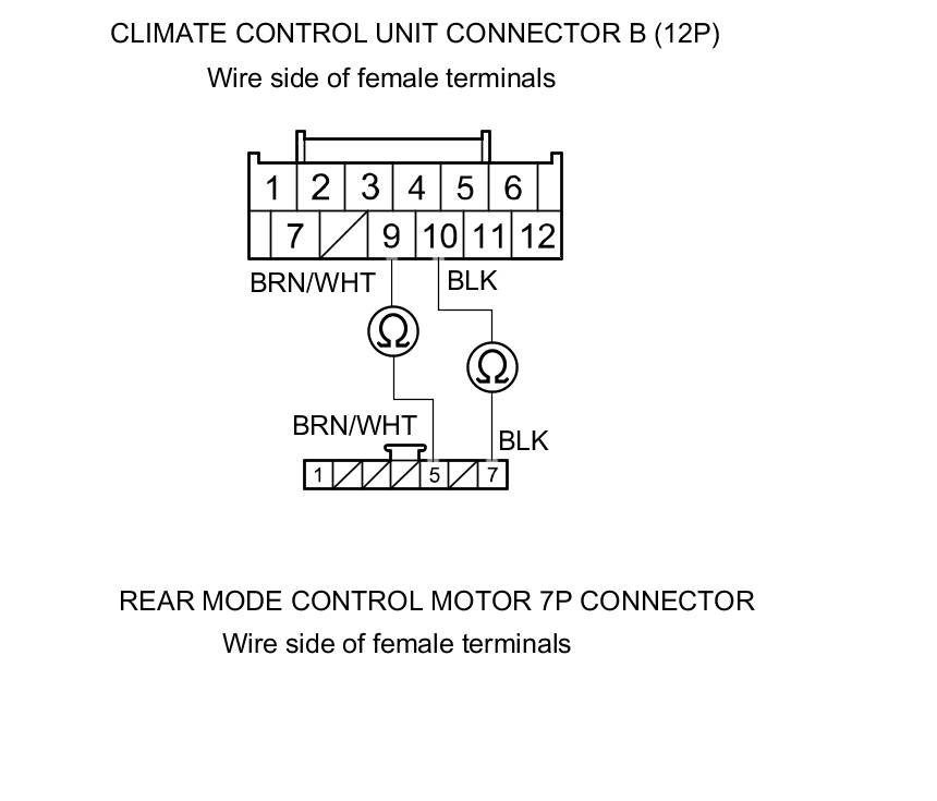11. Check for continuity between the following terminals of climate control unit connector B (12P) and the rear mode control motor 7P connector.