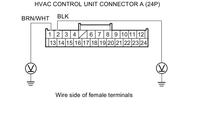 8. Check for continuity between body ground and HVAC control unit connector A (24P) terminals No. 1 and No. 2 individually.