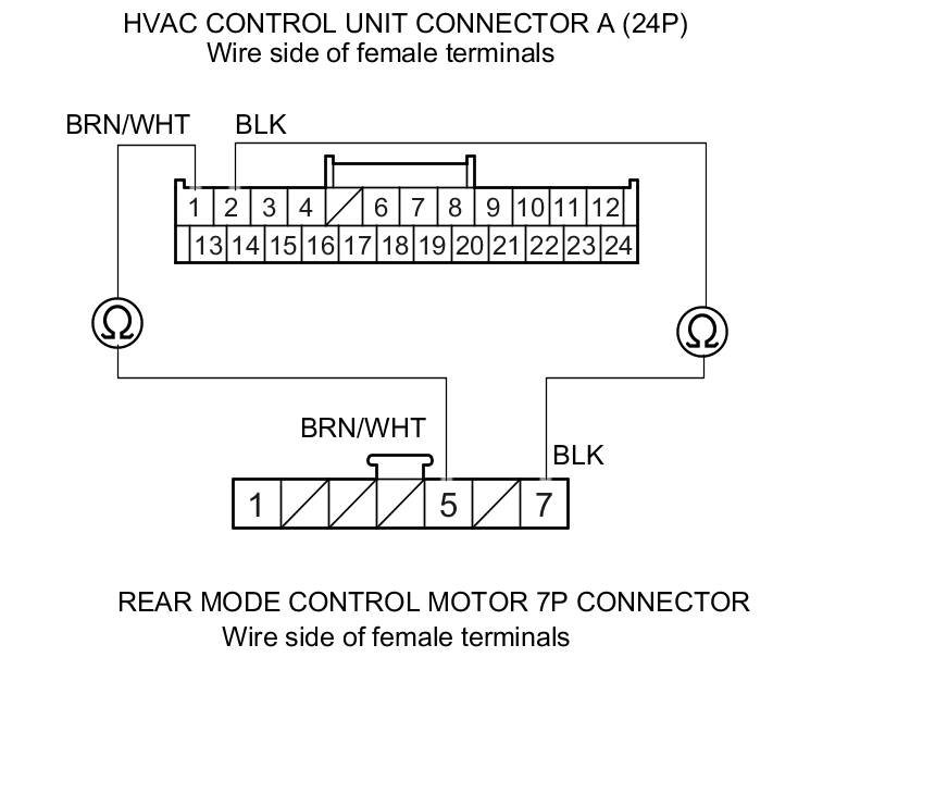 11. Check for continuity between the following terminals of HVAC control unit connector A (24P) and the rear mode control motor 7P connector.