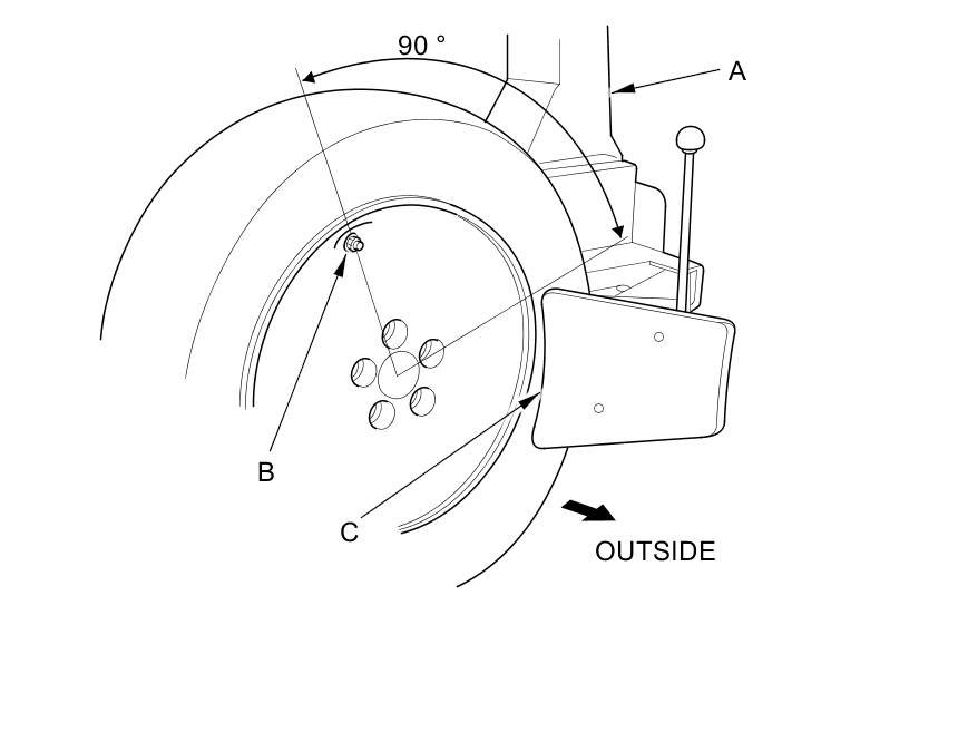 - Position the wheel as shown so the valve stem (B) is 90 degrees from the bead breaker (C) as shown.