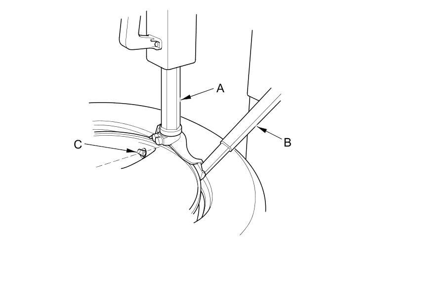 5. Position the wheel so that the tire machine (A) and the tire iron (B) are next to the valve stem (C), and will move away from it when the machine starts. Then remove the tire from the wheel.