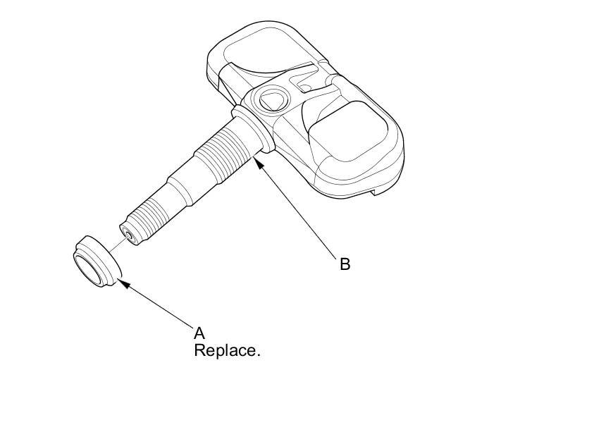 7. Remove and replace the valve stem grommet (A), from the tire pressure sensor (B).