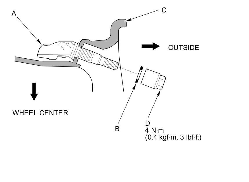2. Install the tire pressure sensor (A) and the washer (B) to the wheel (C), and tighten the valve stem nut (D) finger tight. Make sure the pressure sensor is resting on the wheel.