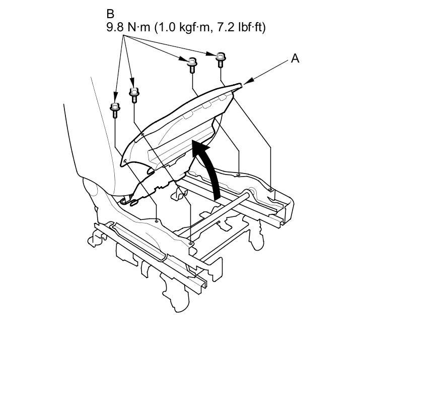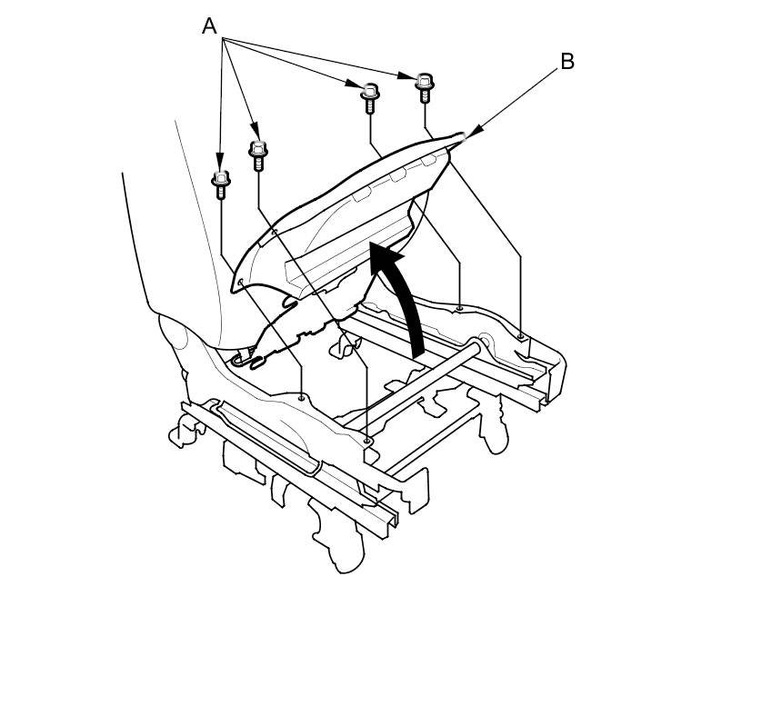6. Remove the bolts (A) from the seat cushion frame (B), then pull up the front side of the seat cushion frame.