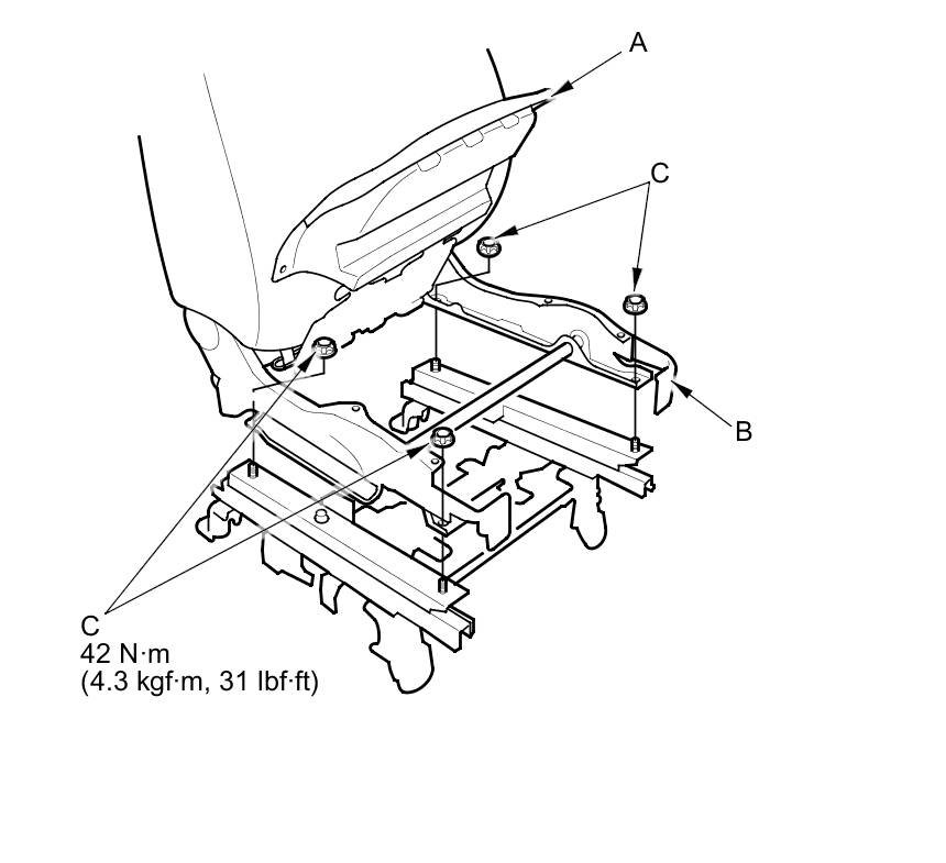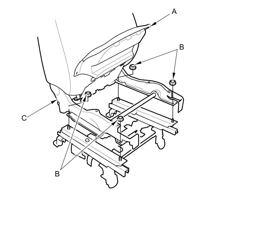 3. With an assistant holding the seat cushion frame (A), install the seat frame (B) with the TORX nuts (C) using a TORX E18 socket.